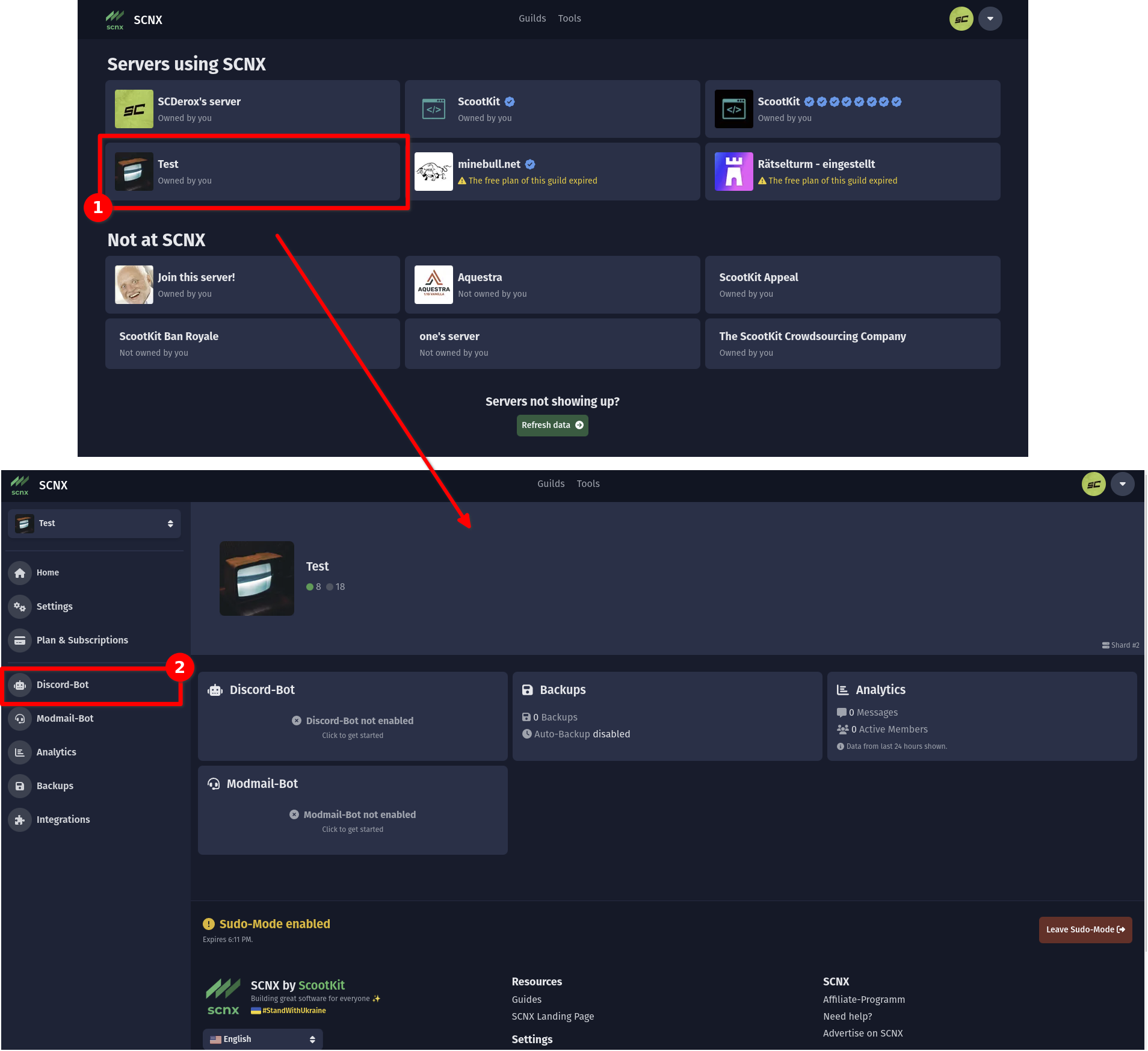 Öffne das SCNX-Dashboard und wähle den Server aus, auf dem du den Bot erstellen willst. Wähle dann "Discord-Bot" in der Sidebar aus.