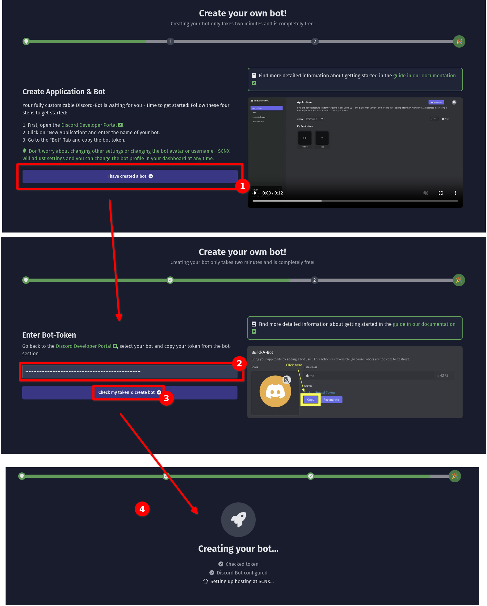 Hier findest du ein Video, was dir zeigt, wie du deinen Discord-Bot erstellst. Wenn du dieser Anleitung gefolgt bist kannst du das Video sicher mit dem Button "Ich habe einen Bot erstellt" überspringen. Als Nächstes wirst du nach deinem Token gefragt, den du in Schritt 1 erhalten hast, anschließend klicke auf "Token überprüfen & Bot erstellen". SCNX prüft nun deinen Token und richtet dann Hosting für deinen Discord-Bot ein - das kann einige Sekunden dauern.