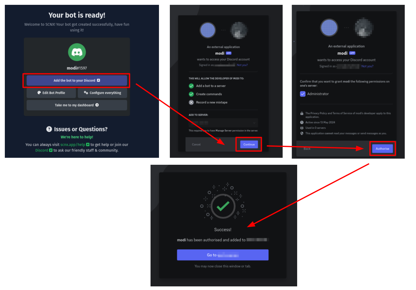 Once SCNX has set up your Modmail, you'll need to invite the Modmail bot to your server. To do this, you only need to click on the "Add the bot to your Discord"-Button. This will open Discord's OAuth2 Grant Screen (that's how nerds call the screen below 🤓). SCNX already selected your server for you. Simply click "Continue" and "Authorize" to finish the process. If you want, you can remove the "Administrator" permission, but this will make it more difficult to use the bot down the line, as SCNX is not yet able to show which feature needs what permissions and handle permission-related error correctly.