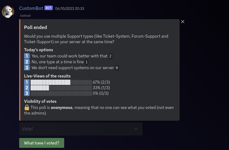| Emojis | In this fields, you can customize the emojis that will be displayed next to each voting option in the dropdown menu and in the embed. Make sure you enter Unicode values for built-in-emojis or valid Emoji-IDs (not just the name) for custom emojis. |